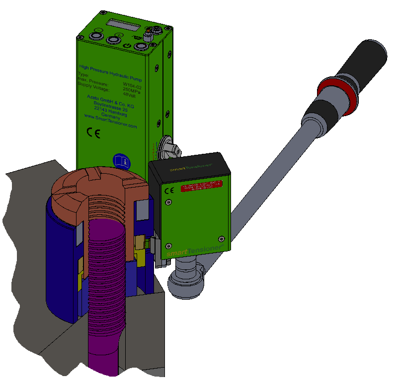After reaching target pressure and the requested axial bolt force, the nut is turned manually using a torque wrench using a 1/2" shaft adapter. The gear drive has been designed for rough and difficult environments allwoing to loosen even rusty or dirty nuts. The adapter shaft and the gears are made of high grade steel. Using a cordless screwdivrt is also possible. After reaching target pressure and the requested axial bolt force, the nut is turned manually using a tommy bar and an integrated nut adapter. After reaching target pressure and the requested axial bolt force, the nut is turned automatically by an integrated high-torque motor. Controlled by the integrated pump, the Automatic Nut Gear Drive allows operating the whole tensioning and de-tensing process without any manual interaction. In addidtion, during the tensiong process the nut is stepwise tightend and the pressure is slightly realeased. This is the fastest way to tension a bolt and to get the lowest setting losses. The gears are made of high grade steel. If the provided motor torque should not be sufficient, an additional 1/2" shaft adapter allows turning the nut with a wrench. |