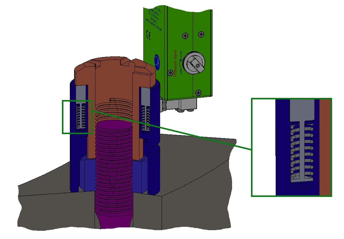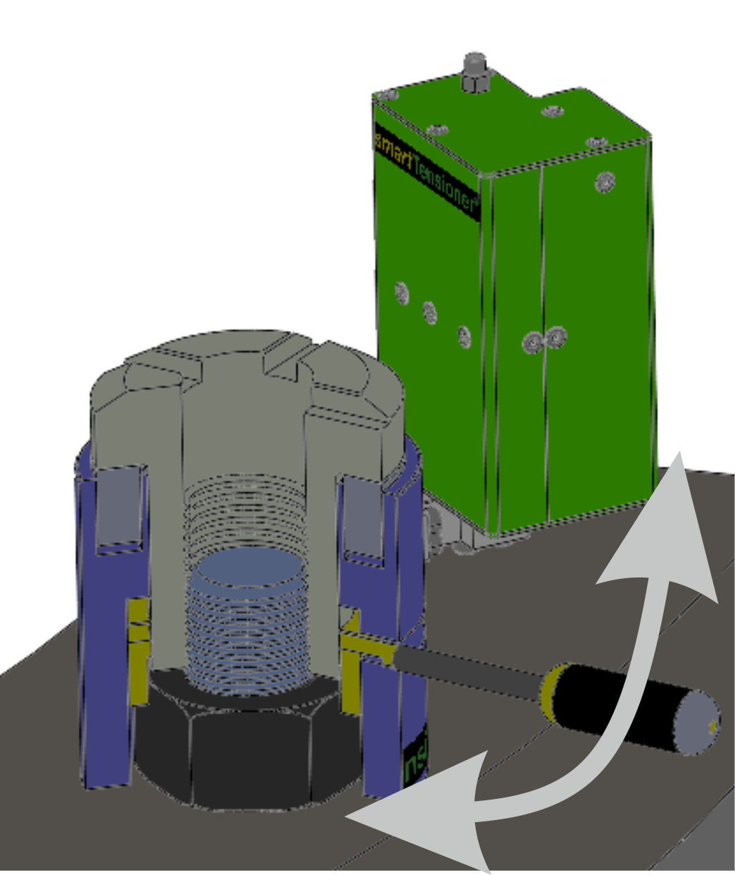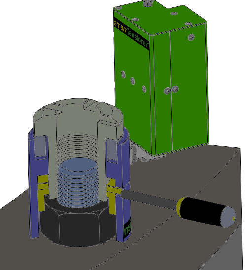 The NutAdapterSpring allows to mount the BNoltTensioner in any position of the hexagonal nut. If the nut adapter should not match with the nut, it is shifted upwards. After the turnimng the adapter, it will glide on the nut supported by a spring.